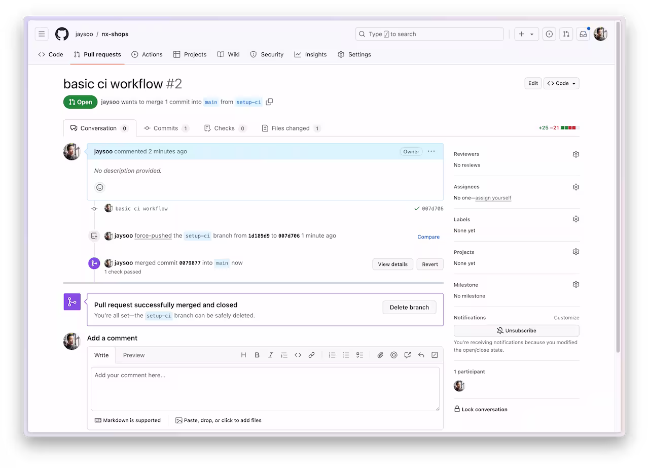 Nx Cloud will create a comment on your PR that gives you a summary of the CI run and a link to dig into logs and understand everything that happened during the CI run.
